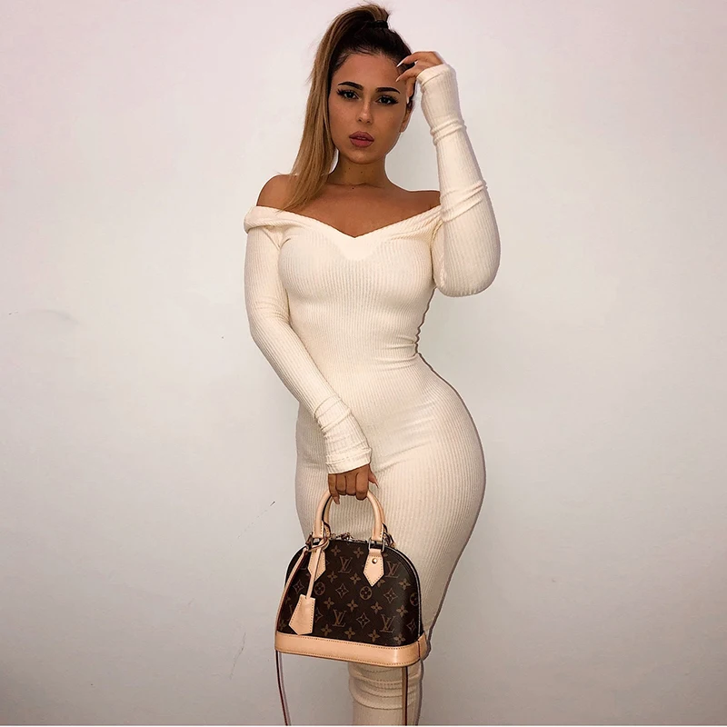 Product Name: NewAsia kobiety jesień sukienka 2019 z długim rękawem bawełna prążkowane sukienki Maxi głębokie dekolt w serek Off ramię Midi obcisła sukienka z dzianiny szata