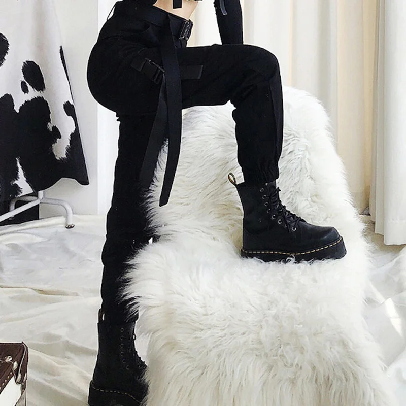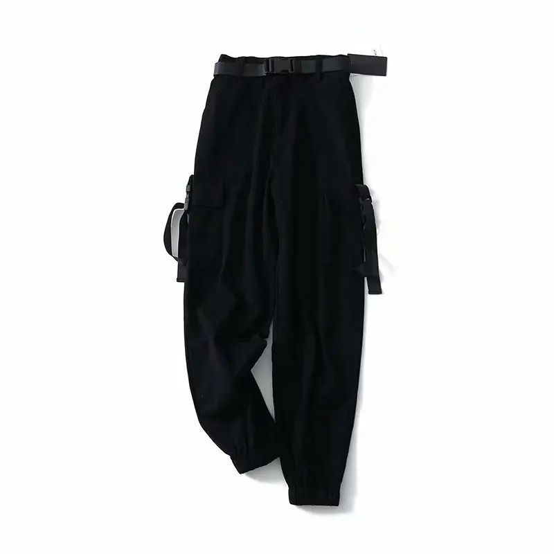Product Name: Wiosna kobiety czarne wojskowe spodnie bojówki Unisex Hip Hop Sashes spodnie BF Harajuku biegaczy kombinezon z wysokim stanem luźne spodnie na co dzień